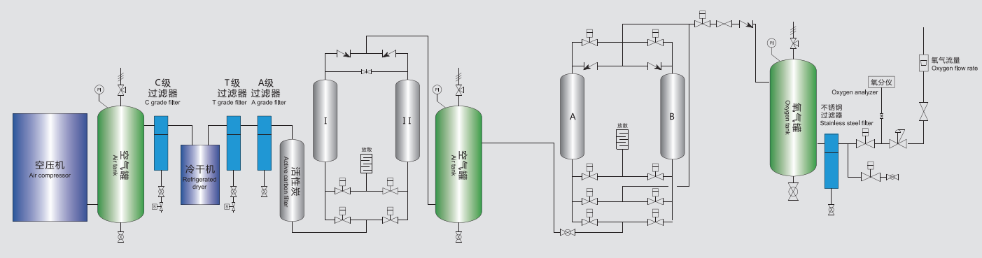 Selepas udara dimampatkan oleh pemampat udara, selepas penyingkiran habuk, penyingkiran minyak dan pengeringan, ia memasuki tangki penyimpanan udara, memasuki menara penjerapan kiri melalui injap pengambilan udara dan injap pengambilan kiri, tekanan menara naik, molecules nitrogen di atas air katil dan memasuki tangki penyimpanan oksigen melalui injap pengeluaran gas kiri dan injap pengeluaran gas oksigen. Proses ini dipanggil sedutan kiri. Tempohnya adalah kira -kira enam puluh saat. Selepas berakhirnya proses sedutan kiri, menara penjerapan kiri dan menara penjerapan yang betul disambungkan melalui injap penyamaan tekanan, supaya tekanan kedua -dua menara seimbang, proses ini dipanggil penyamaan tekanan, dan tempohnya adalah 3 hingga 5 saat. Selepas akhir penyamaan tekanan, udara termampat memasuki tangki oksigen melalui injap pengambilan udara dan injap pengambilan yang betul. Proses ini dipanggil sedutan yang betul, dan tempohnya adalah kira -kira enam puluh saat. Pada masa yang sama, oksigen yang terserap oleh penapis molekul zeolit di menara penjerapan kiri dikeluarkan kembali ke atmosfera melalui pengurangan tekanan injap ekzos kiri. Sebaliknya, apabila lajur kiri terserap, lajur kanan juga desorbs. Untuk sepenuhnya menunaikan nitrogen yang dikeluarkan dari penyahmampatan dalam penapis molekul ke atmosfera, oksigen disapu melalui injap pukulan terbalik yang biasanya terbuka ke menara penjerapan desorpsi, dan oksigen di menara terbalik ditiup keluar dari menara penyerapan. Proses ini dipanggil blowback, dan ia berjalan seiring dengan desorpsi. Selepas berakhirnya sedutan yang betul, masukkan proses mengimbangi tekanan, dan kemudian beralih ke proses sedutan kiri, dan teruskan kitaran.